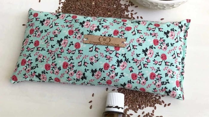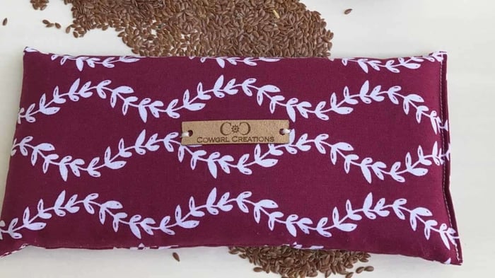 "We have found that rice not only has a cooked grain smell to it when heated but it also doesn’t hold the heat for very long. Flax seed is known to hold heat longer, and it evenly distributes pressure making it soothing on your face and eyes." -Mackenzie Hamilton, owner of Cowgrl Creations (where the amazing eye pillow photos came from)